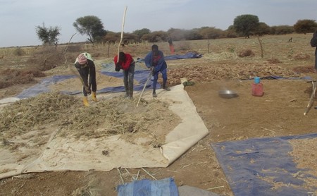 De retour à Bour-Diéri, il exploite les terrains de culture de la famille ; une superficie estimée à six hectares, le rendement de son champ cette année a atteint 2,5 tonnes. Le mil très blanc déposé sur une grande bâche forme un tas élevé. Sans compter les rendements en graines de niebbé et en aliments de bétail, feuilles de niebbe et tiges de mil.